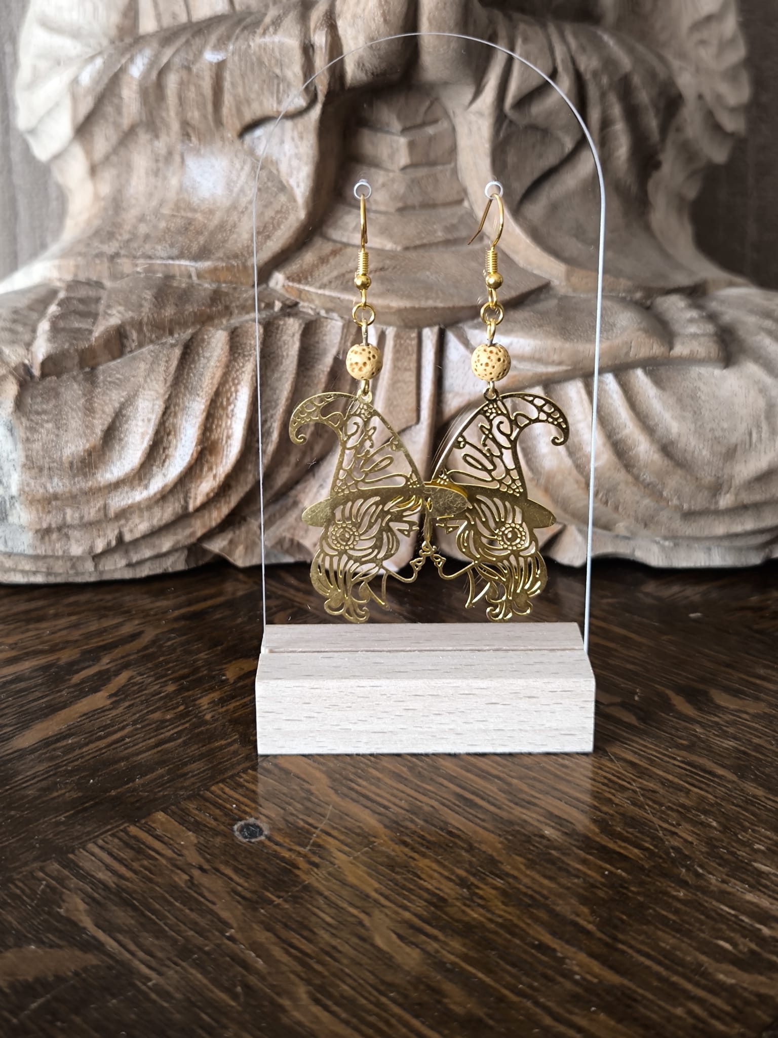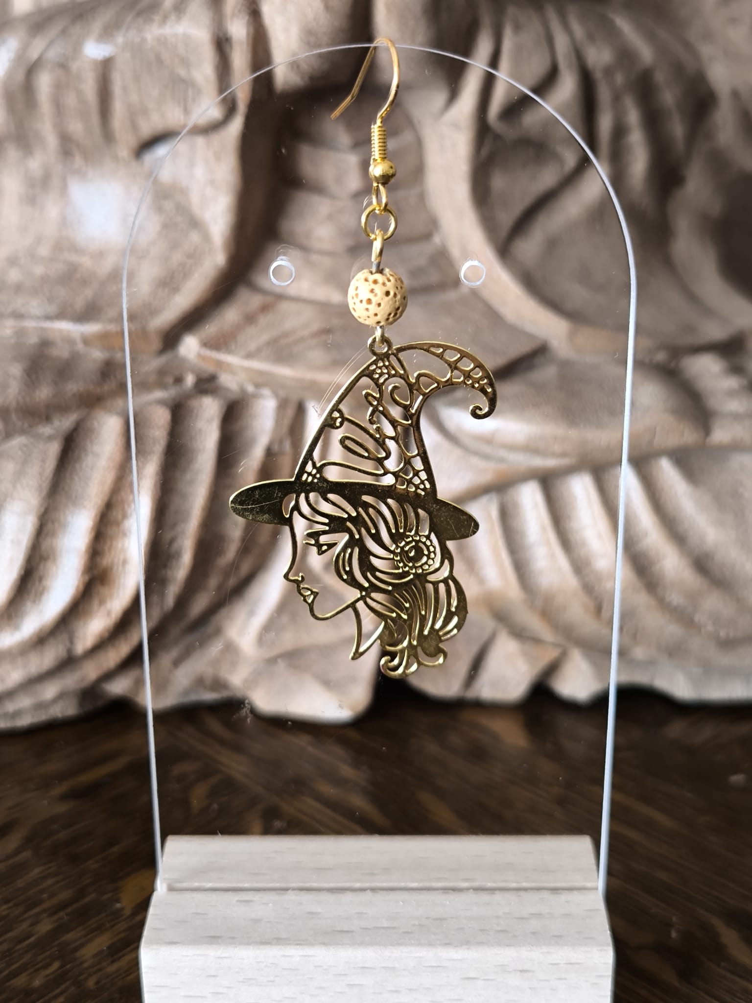 Boucles d’Oreilles Aromathérapie – sorcière dorée et pierre poreuse