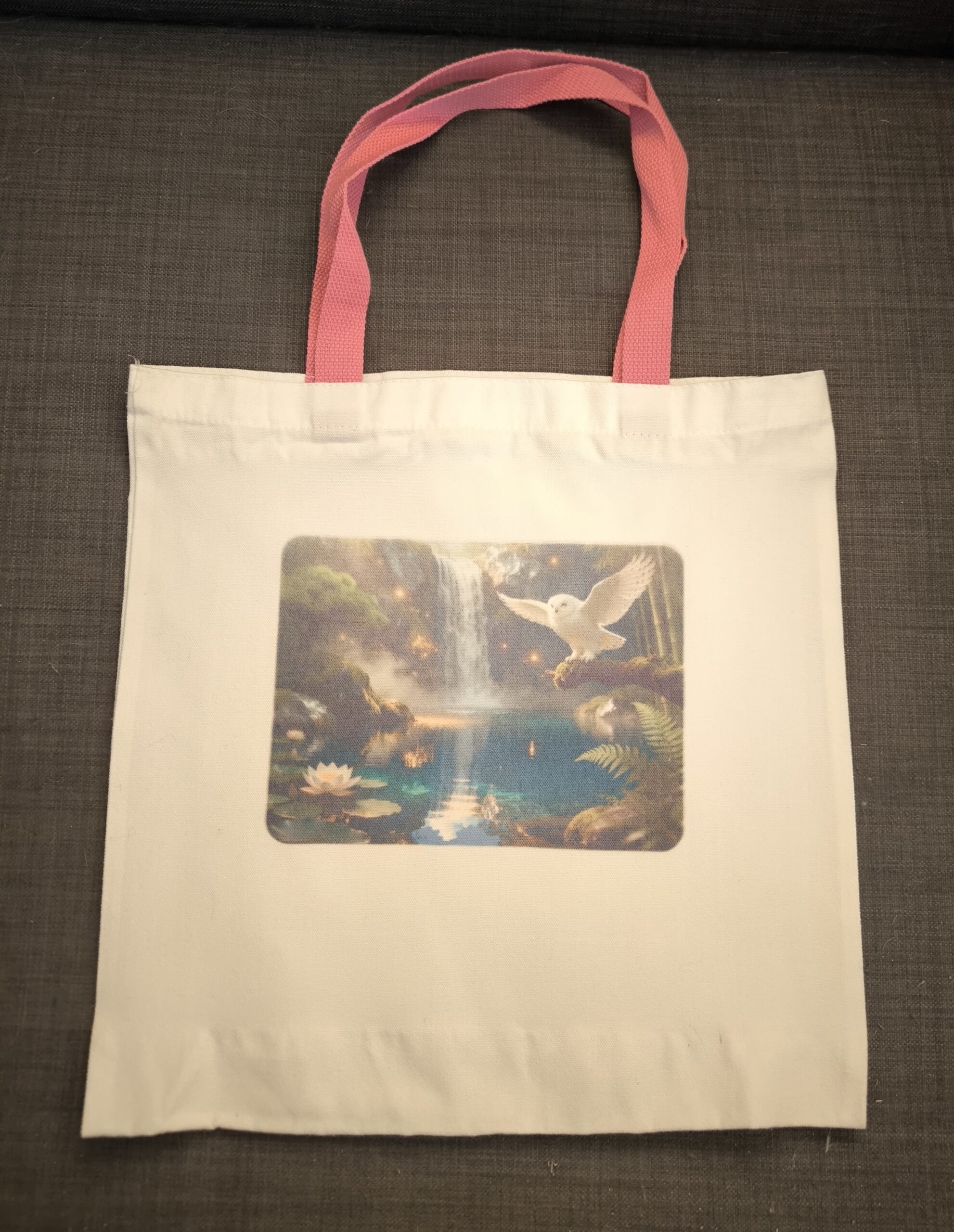 Apportez une touche de magie et de douceur à votre quotidien avec ce tote bag et sa pochette assortie Hibou et Cascade – Sagesse et Lumière.