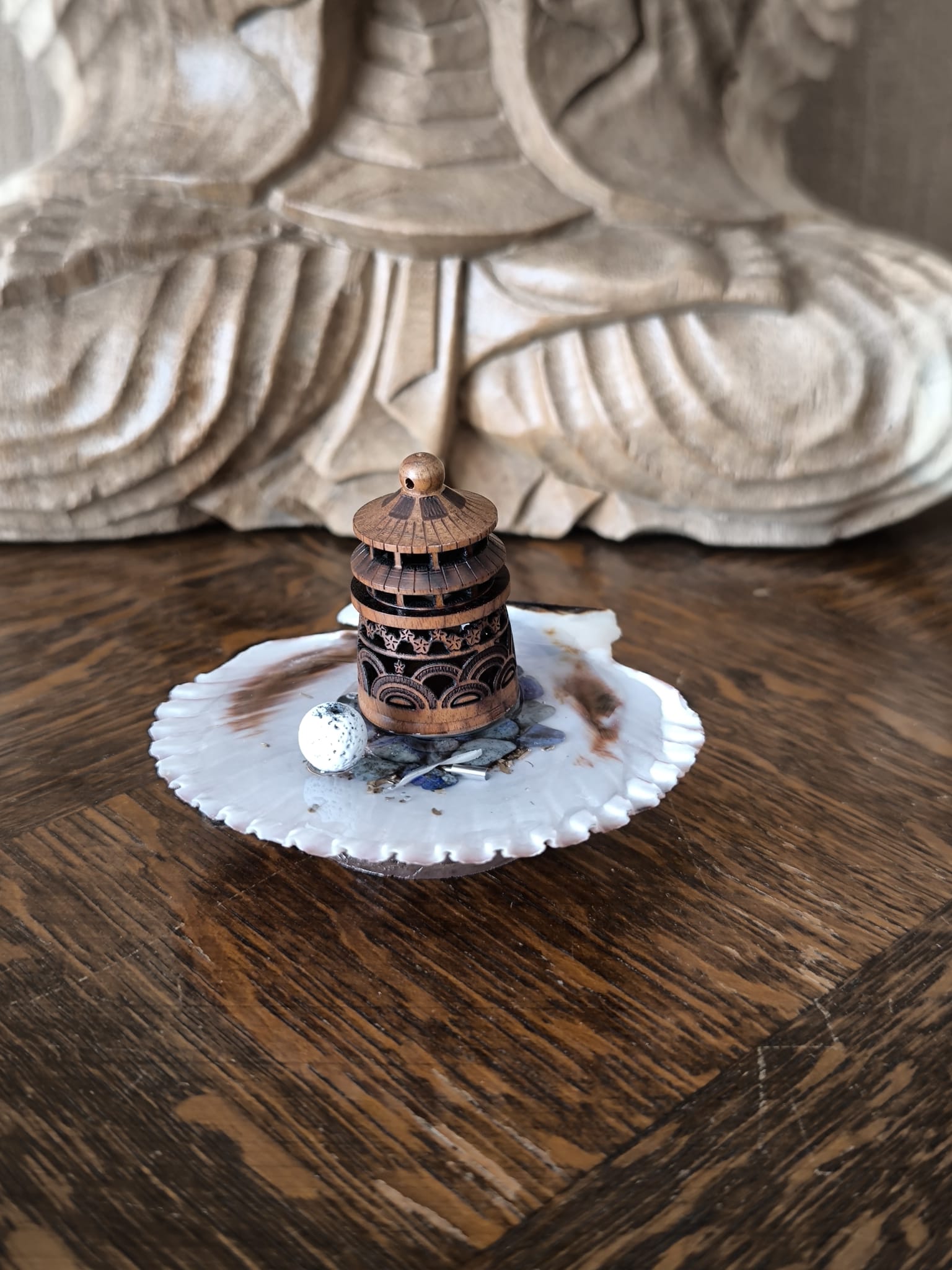 Ce mamour en coquillage type orgonite associe résine, métaux et lapis-lazuli, pierre de sagesse et d’équilibre. Surmonté d’une pagode en bois ouvrante, il accueille un petit tampon d’aromathérapie pour diffuser vos huiles essentielles. Avec sa perle poreuse servant aussi de support pour encens, il est à la fois décoratif et énergétique. Idéal pour créer une ambiance spirituelle, apaisante et harmonieuse dans tout espace de vie.
