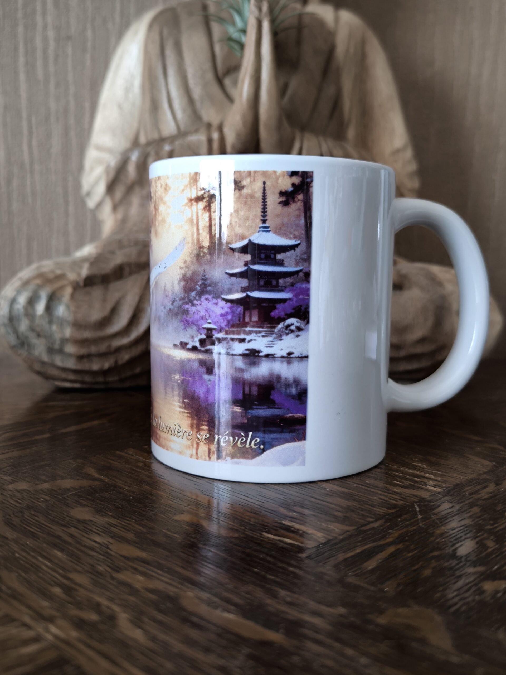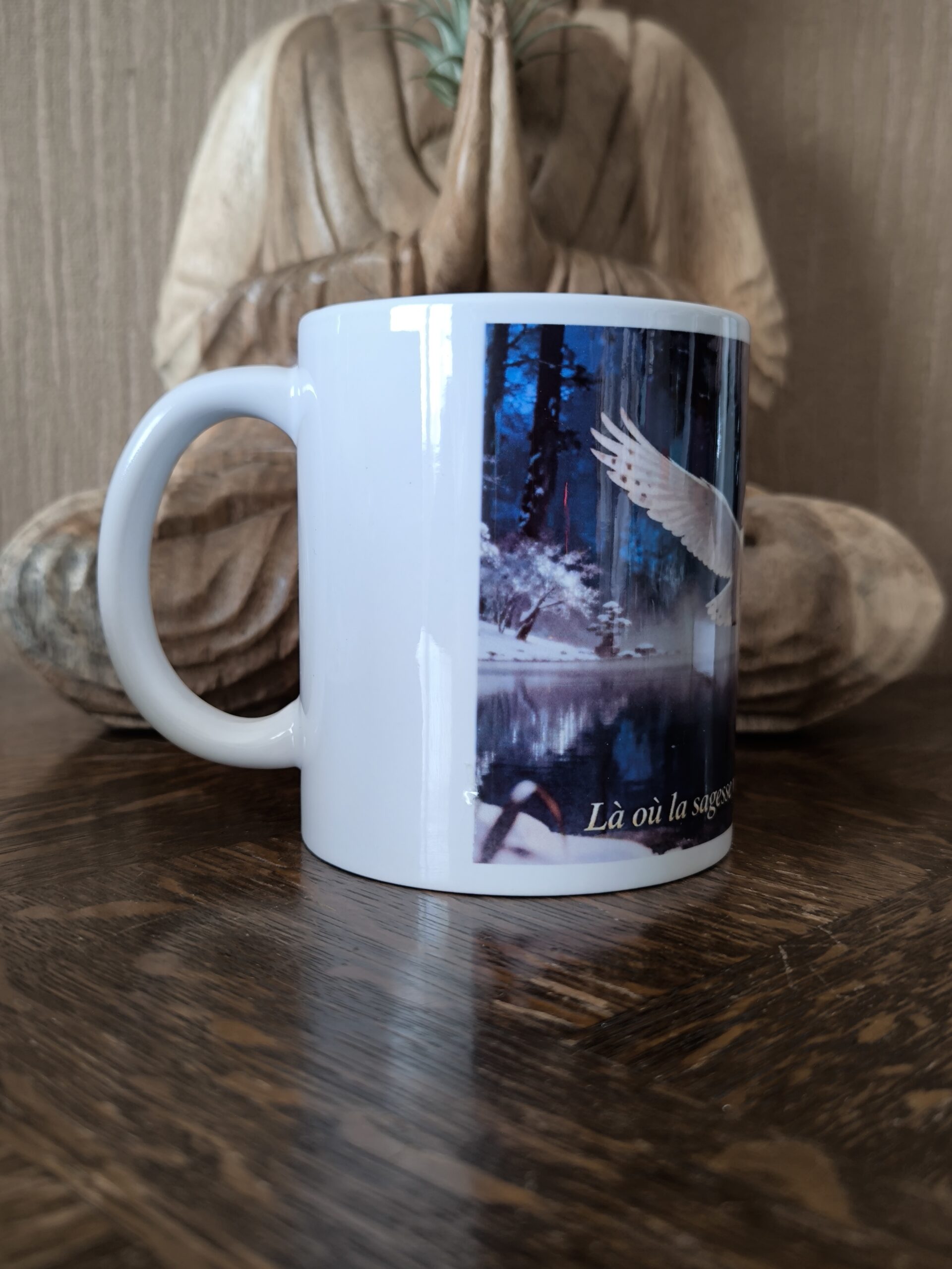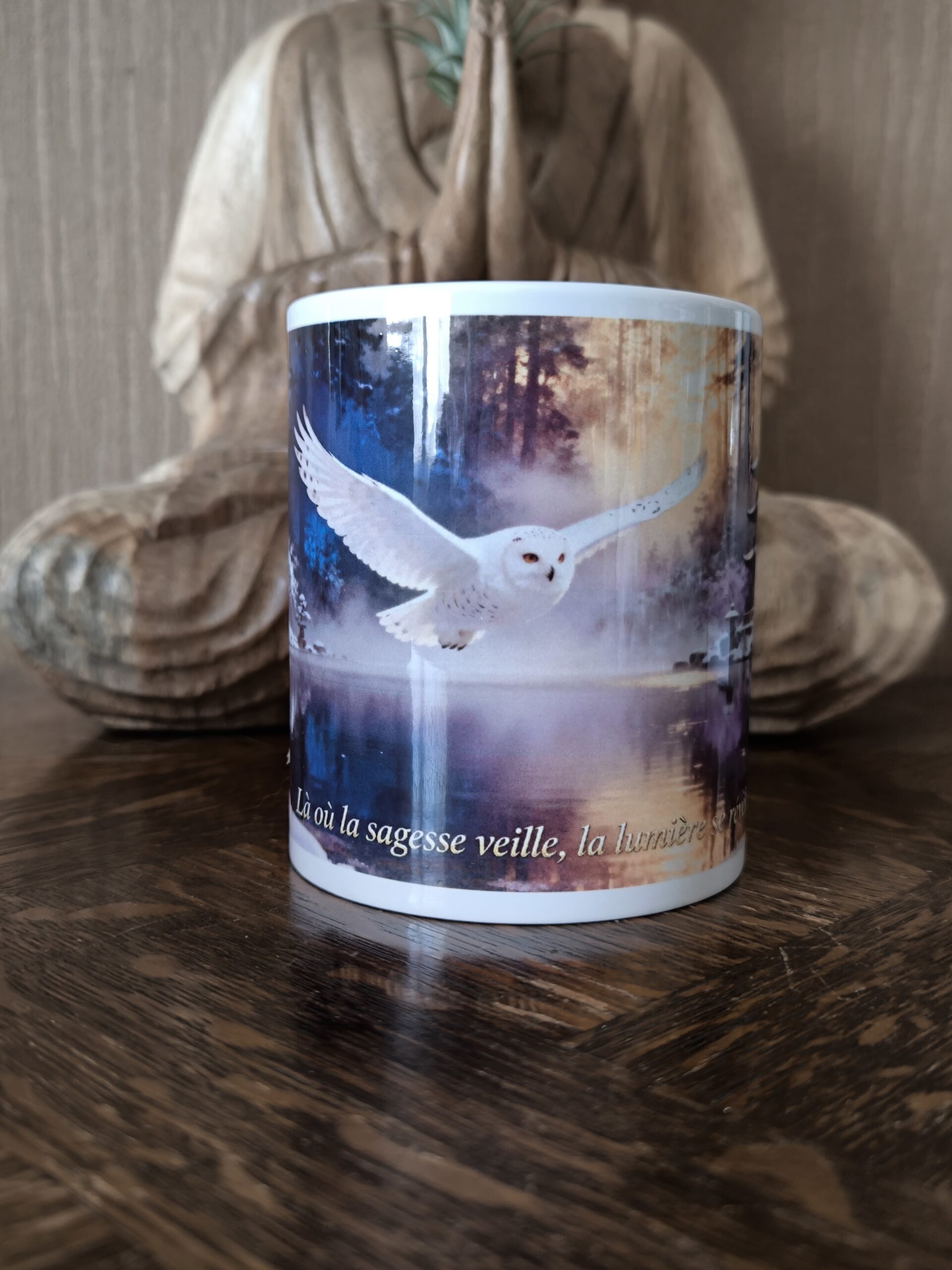 Ce mug Chouette et Sagesse symbolise l’équilibre et la clarté intérieure. Son illustration lumineuse d’une chouette blanche en vol au-dessus d’un lac et sa citation inspirante « Là où la sagesse veille, la lumière se révèle » en font un objet à la fois poétique et apaisant. En céramique blanche, il allie douceur, résistance et sérénité pour vos moments de pause zen.