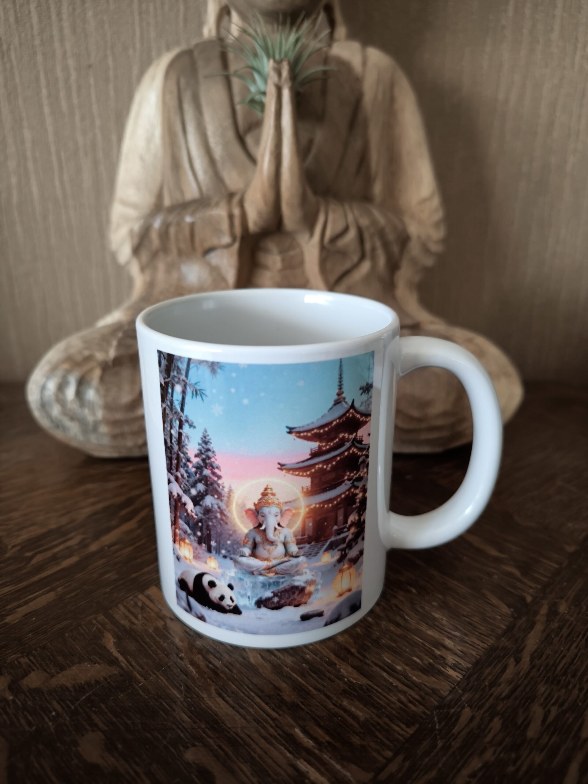 Apportez une touche de douceur et de spiritualité à vos moments de détente avec ce mug Ganesh et Panda , Sérénité d’Hiver.