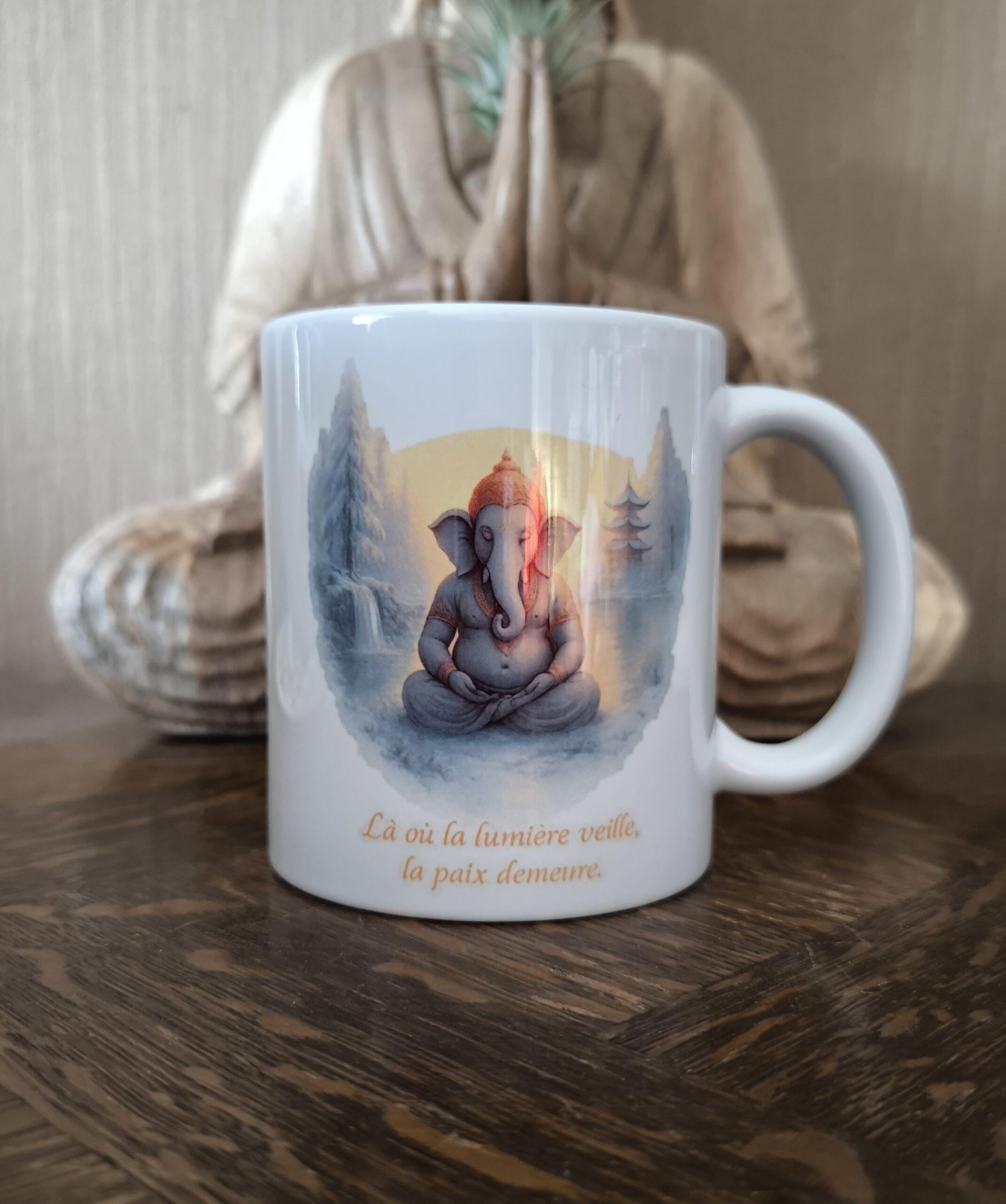 Invitez la sérénité dans votre quotidien avec ce mug Ganesh Lumière, symbole de paix, de sagesse et de prospérité.