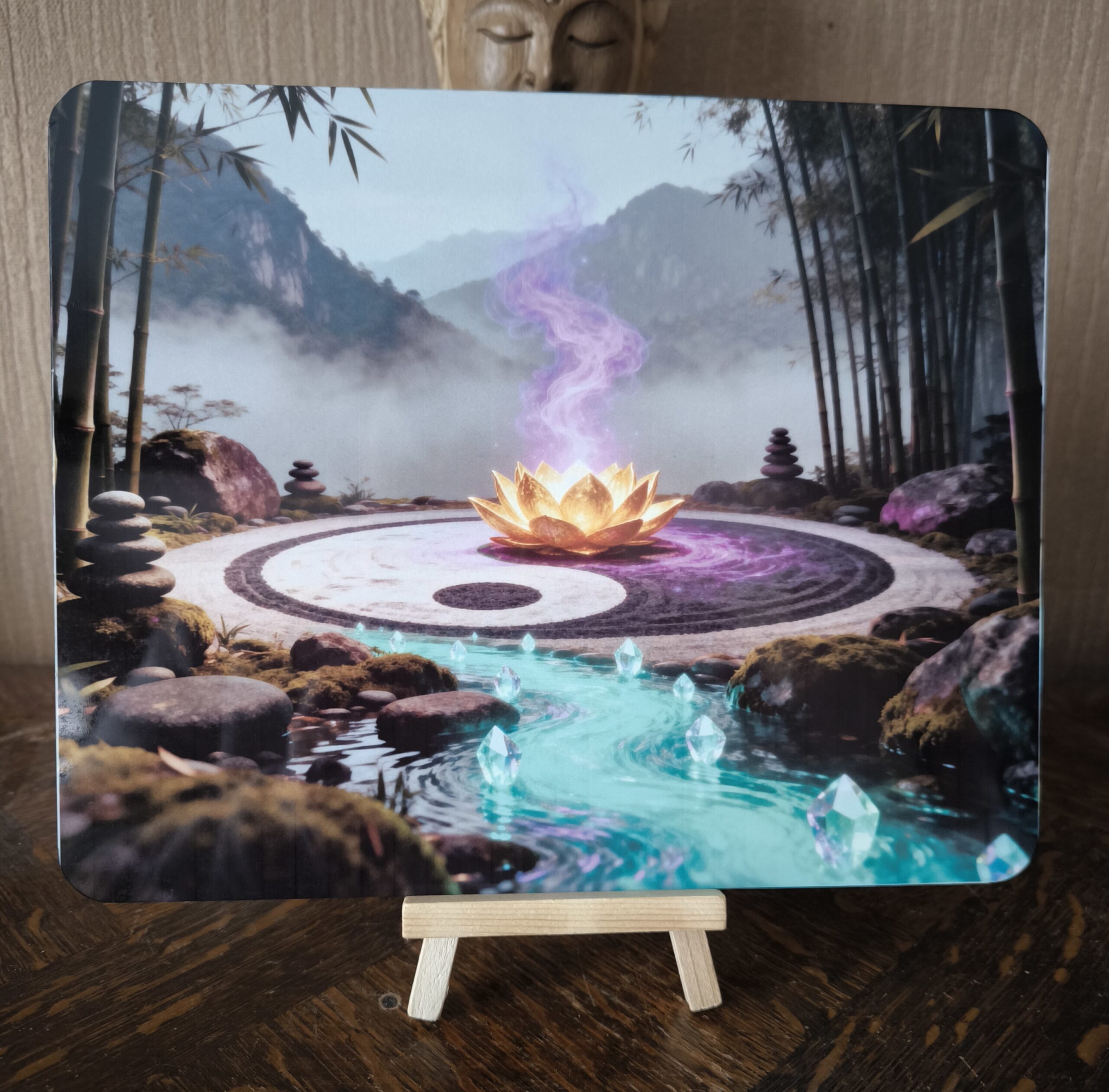 L’illustration met en scène un lotus doré incandescent, dégageant une énergie violette, posé au centre d’un grand Yin Yang tracé dans le sable. Un ruisseau turquoise cristallin s’en échappe, entouré de pierres et de bambous, dans un paysage brumeux et apaisant.