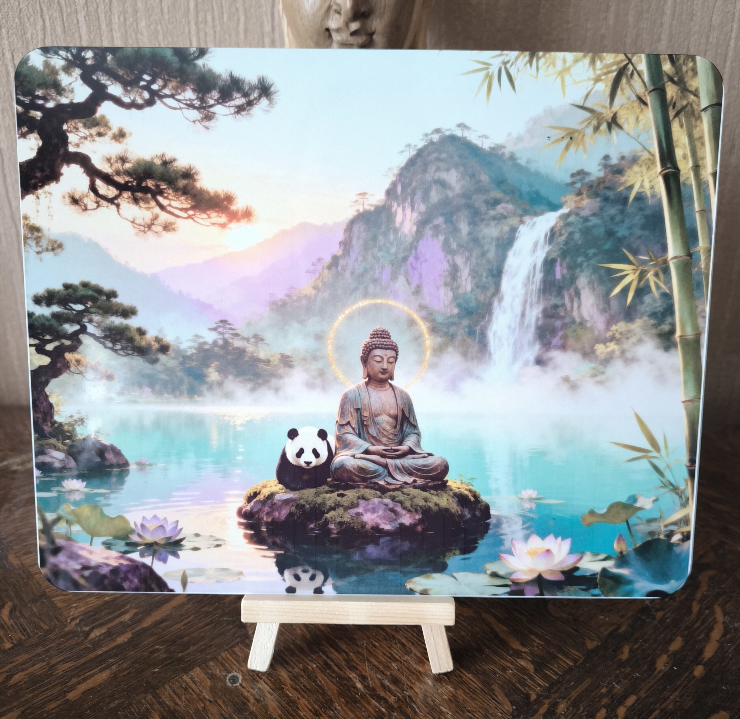 • Motif : Bouddha méditant, panda, lac turquoise, cascade et paysage zen