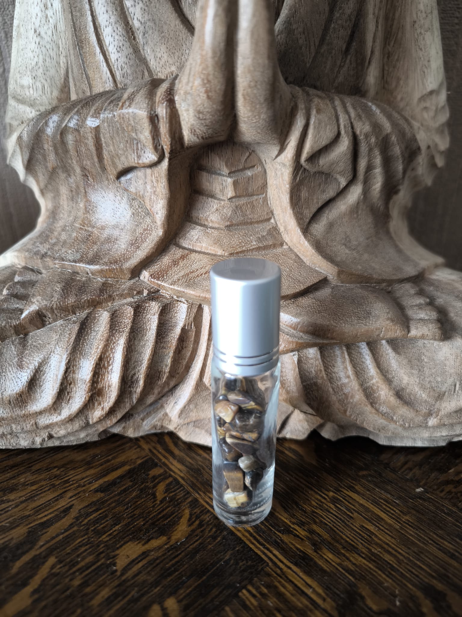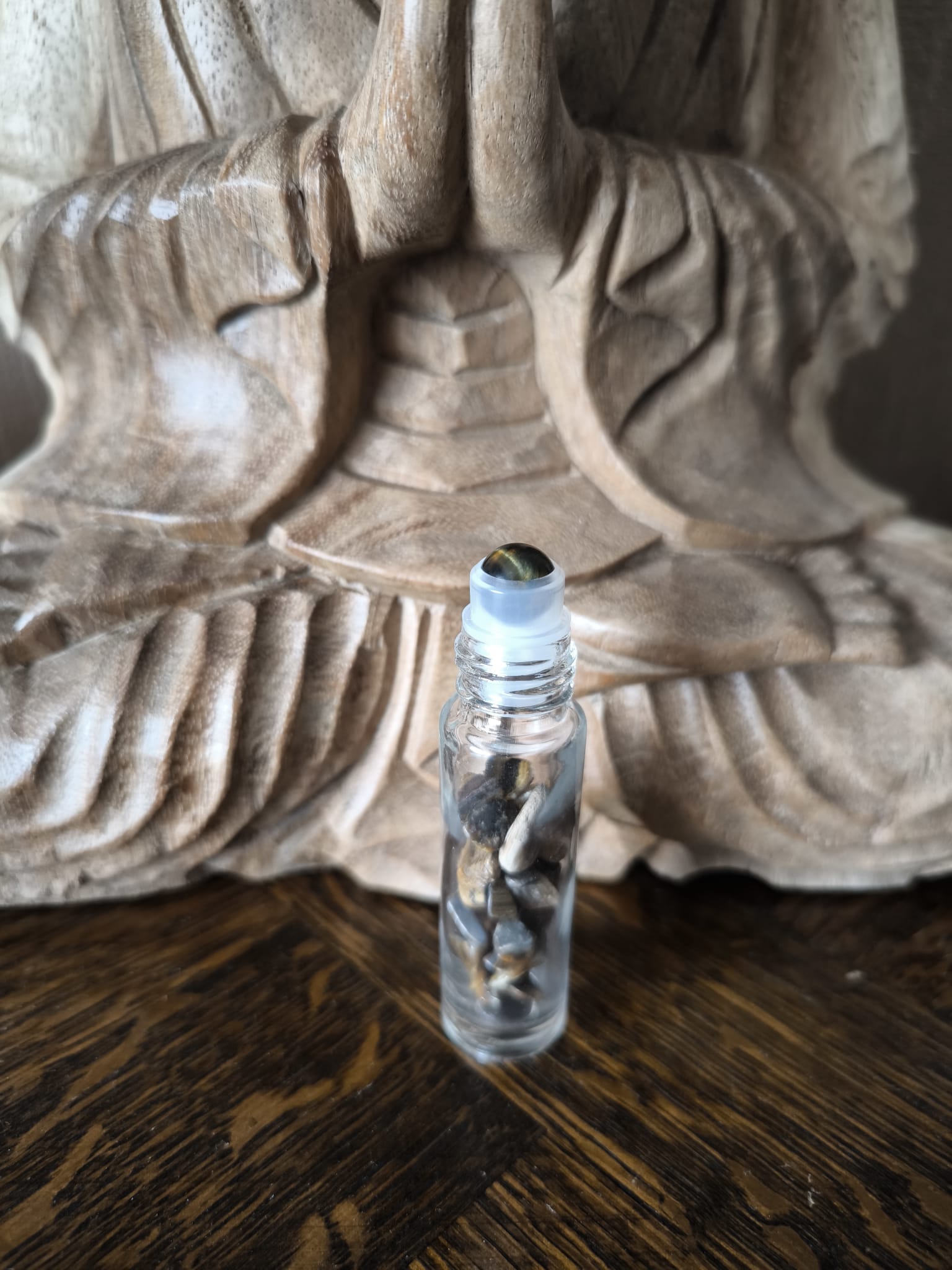 Ce roll-on diffuseur en verre est garni de véritables éclats d’Oeil de Tigre, pierre reconnue pour renforcer la confiance en soi et stimuler l’énergie personnelle. Sa bille d’application lisse permet une diffusion douce et ciblée de vos huiles essentielles ou huiles de massage. Compact et élégant, il vous accompagne partout, alliant bien-être, équilibre énergétique et praticité au quotidien.
