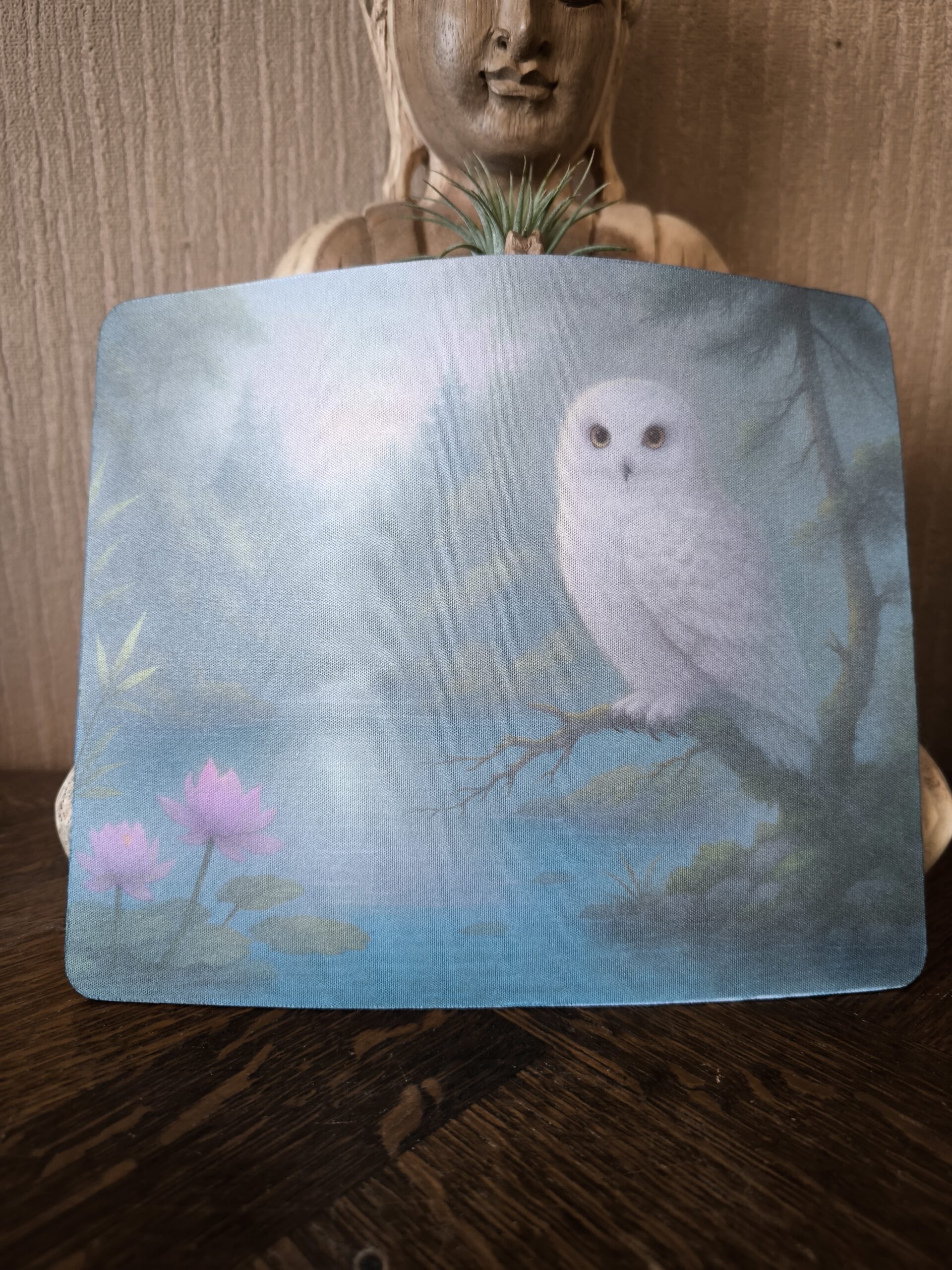 Le tapis de souris Chouette Blanche & Lotus – Sérénité du Lac invite à la méditation et à la tranquillité.